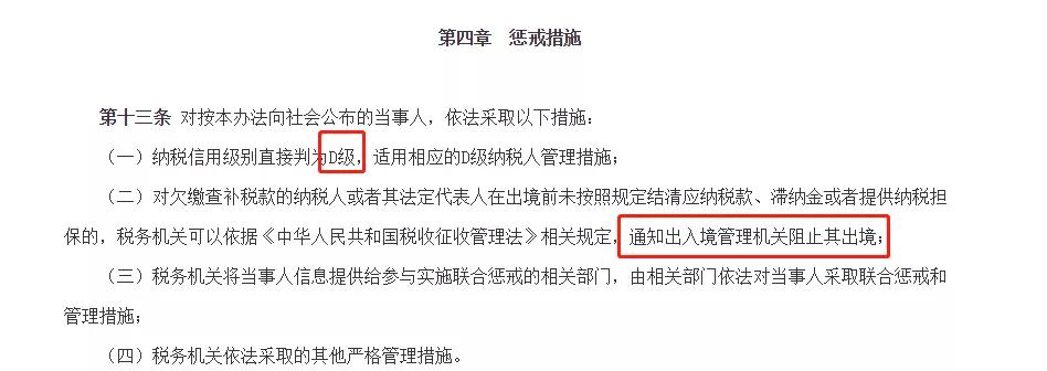 For such taxpayers above, their tax credit rating will be directly subject to a “Class D” rating. The tax authority has the right to notify immigration authorities to prevent them from leaving China.