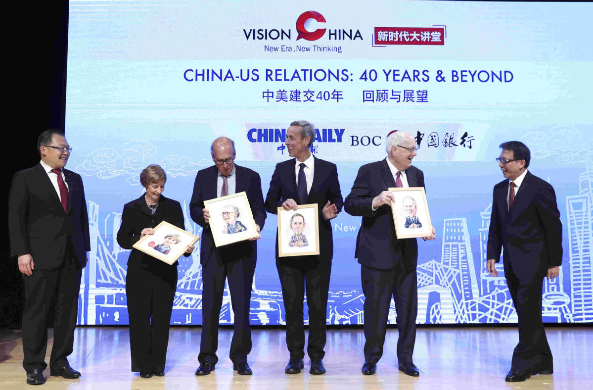 Zhou Shuchun (right), publisher and editor-in-chief of China Daily, and Xu Chen (left), president and CEO of Bank of China USA, present gifts to guest speakers Kenneth Quinn (second right), president of The World Food Prize, Connie Sweeris (second left), former US ping-pong champion, Craig Allen (third right), president of the US-China Business Council, and Stephen Roach, senior fellow at the Yale University Jackson Institute of Global Affairs at the Vision China event at Asia Society in New York on Tuesday. [Feng Yongbin/China Daily]